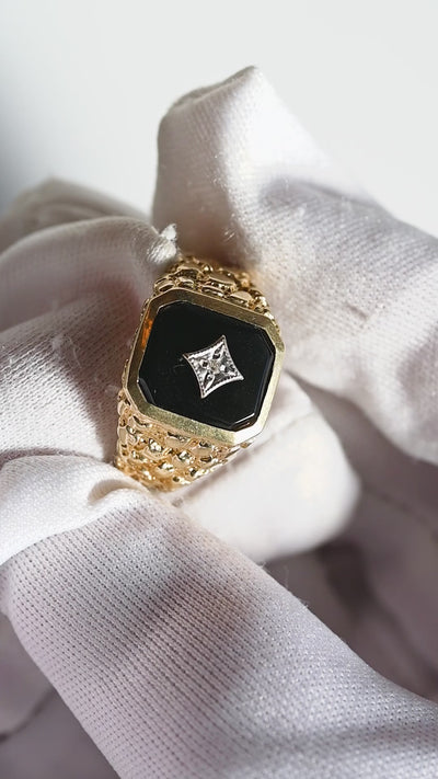 漆黒のオニキスを夜空に見立て、その中心で一石のダイヤモンドが永遠の輝きを放つ。 ヴィンテージ・ジュエリーにおいて「道標」や「希望」を象徴する**星留め(スター・セッティング)**が施された、クラシックな魅力溢れるシグネットリングです。