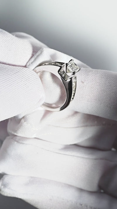 主役は、中央に鎮座する約0.70カラットの「プリンセスカット・ダイヤモンド」。